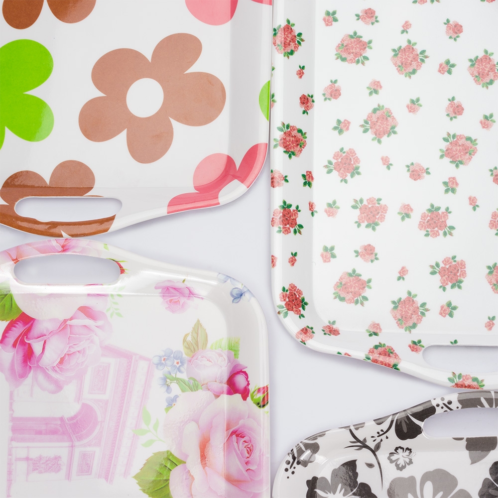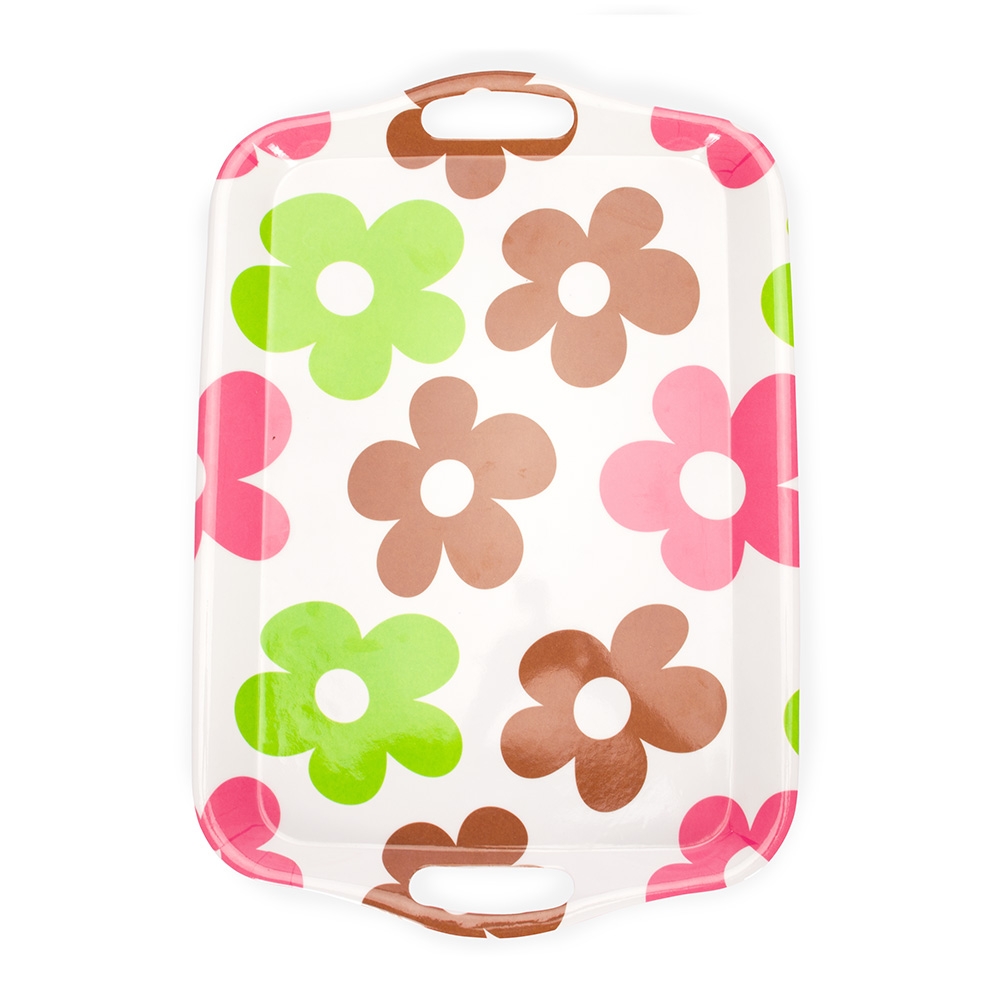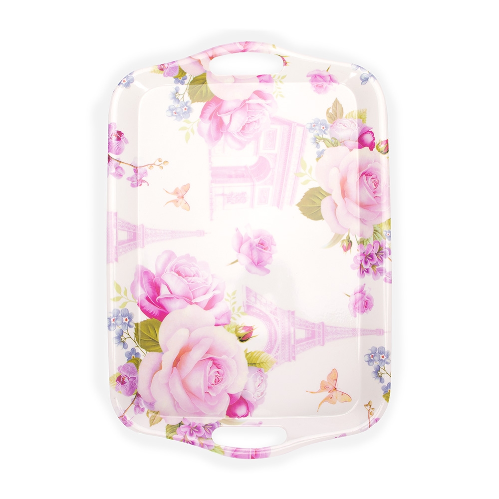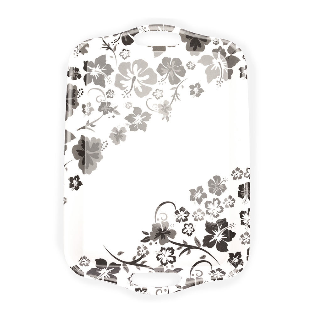 Descrição: Bandeja retangular em melamina, material conhecido pela resistência a impactos, leveza e facilidade de limpeza. Possui alças laterais que facilitam o manuseio.