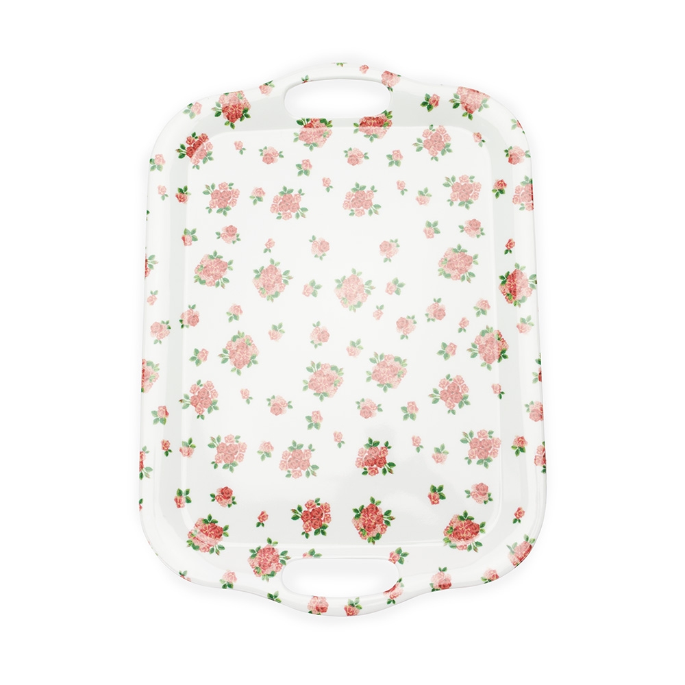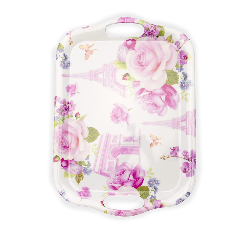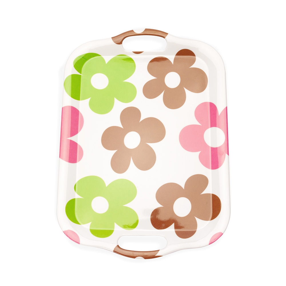 Descrição: Bandeja retangular em melamina, material leve, resistente a impactos e fácil de limpar. Contém duas alças laterais para transporte.